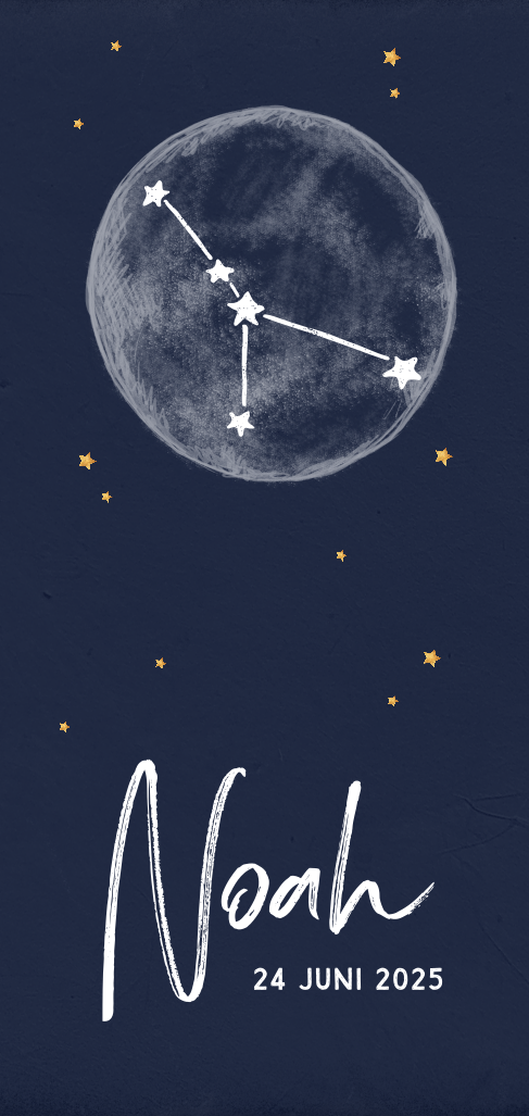 Stoer en trendy geboortekaartje met als thema sterren. Wat is het sterrenbeeld van jouw kleintje? Je maakt deze hippe kaart compleet met eigen teksten en een bijpassende envelop in bijvoorbeeld goudlook. Tip: op natuurkarton komt hij erg mooi uit!
