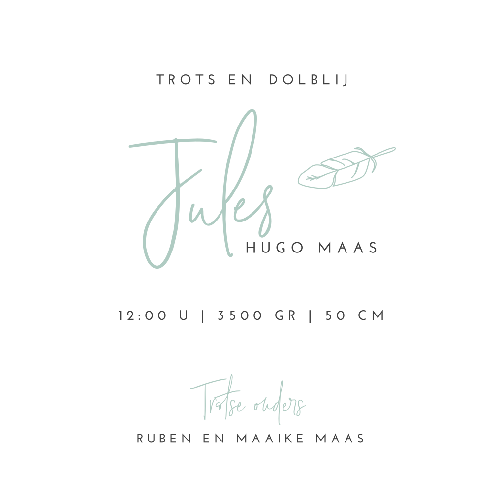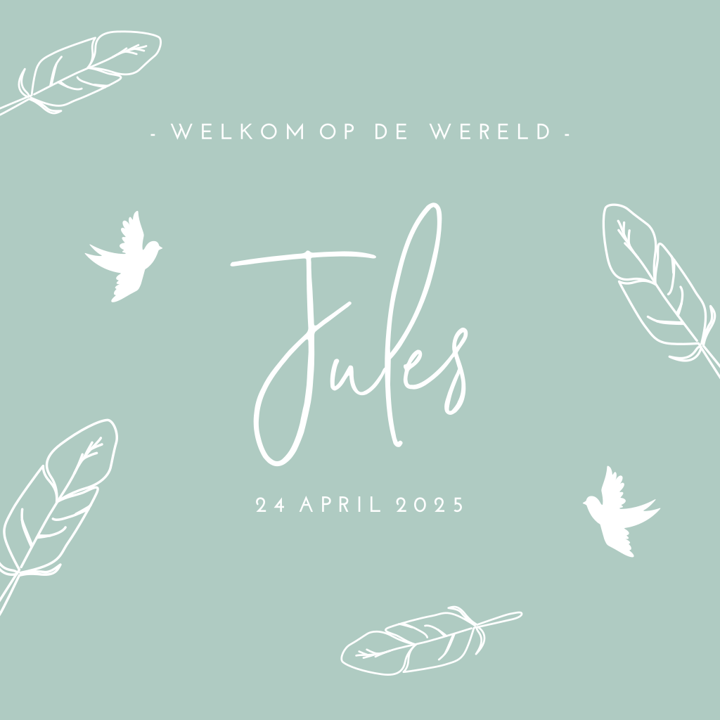 Wat een hip geboortekaartje voor een jongen met getekende veertjes op een groene achtergrond! Leuk zijn ook de vogeltjes van silhouet. Kleuren en lettertypes zijn naar wens aan te passen. Maak dit kaartje persoonlijk door een eigen foto toe te voegen aan de binnenkant!
