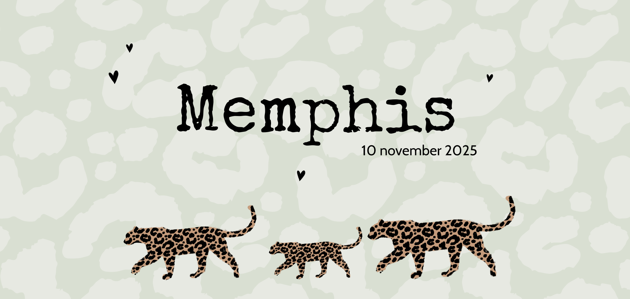 Drie panters op je geboortekaartje: wat stoer! Leuk is dat het achtergrondpatroon ook een panterprint heeft. De kleine, zwarte hartjes maken dit lieve kaartje bovendien helemaal compleet! Tip: Oud-Hollands papier met een envelop van kraftpapier staat hier erg mooi bij.