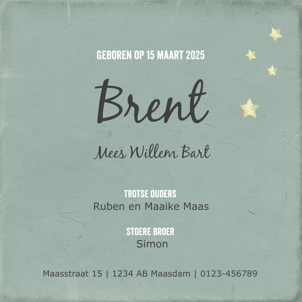 Stoer kaartje voor de geboorte van je zoon met een hippe stempel in goudlook, een label en mooie sterren. Pas alle lettertypes aan naar wens.