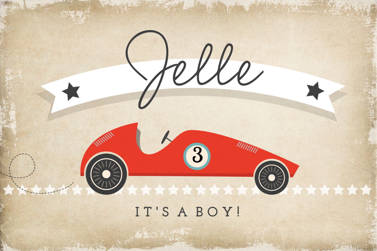 Retro geboortekaartje voor een jongen, met stoere rode raceauto en sierlijke typografie.