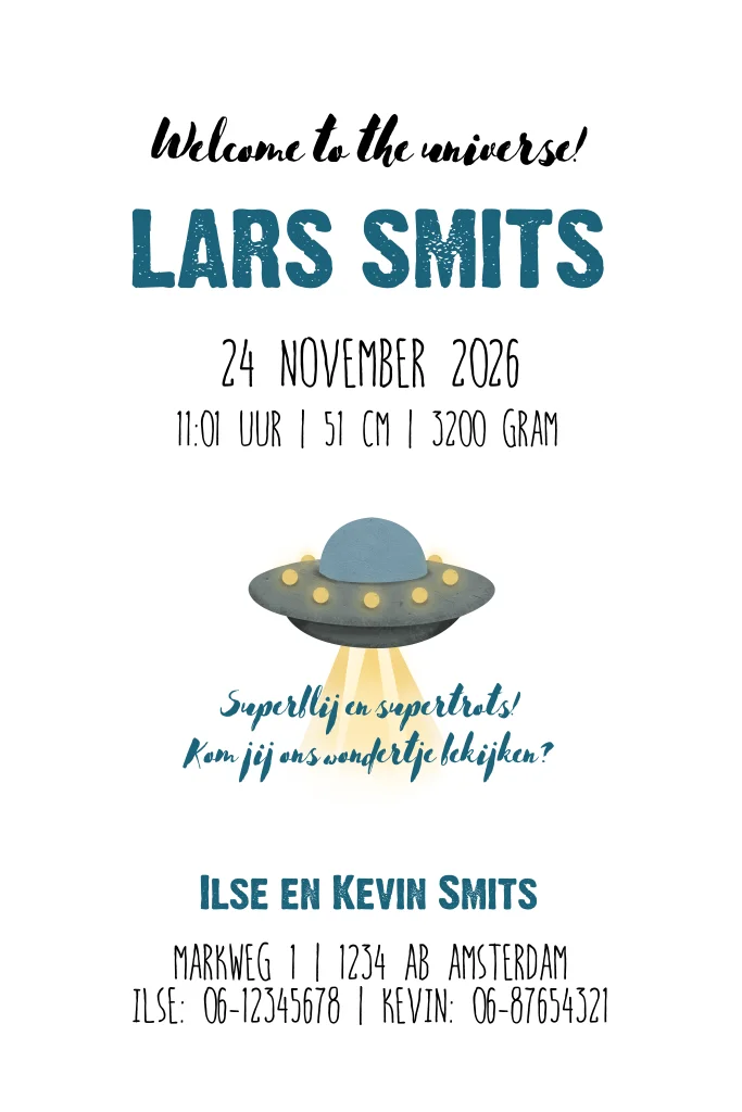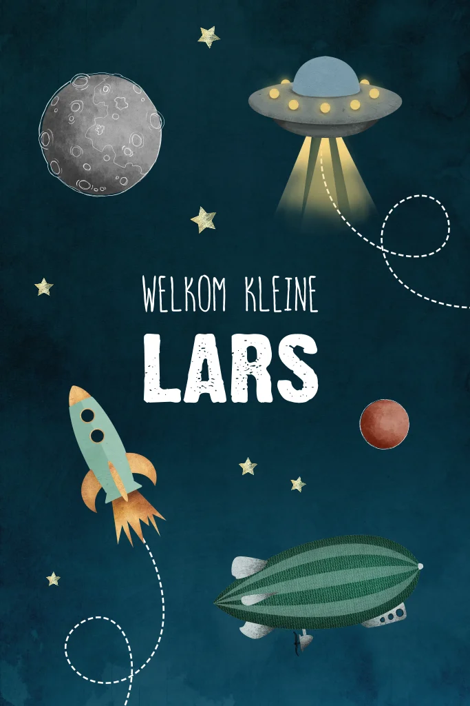 Een zeppelin, een raket, een ufo, planeten en sterren. Het is allemaal te vinden op dit geboortekaartje voor een jongen. Pas de kaart aan en bestel je enveloppen van tevoren.