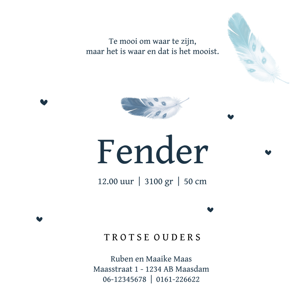 Het bewijs dat hip en klassiek goed samen kunnen! Dit geboortekaartje heeft unieke handgetekende veertjes. Dit kaartje is geheel naar eigen wens te maken.