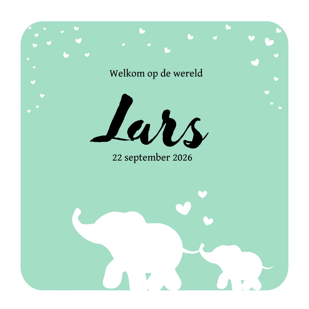 Wat een leuk geboortekaartje! De olifantjes en de hartjes maken hem heel lief en schattig. Andere achtergrondkleur of bijpassende envelop? Alles kan!
