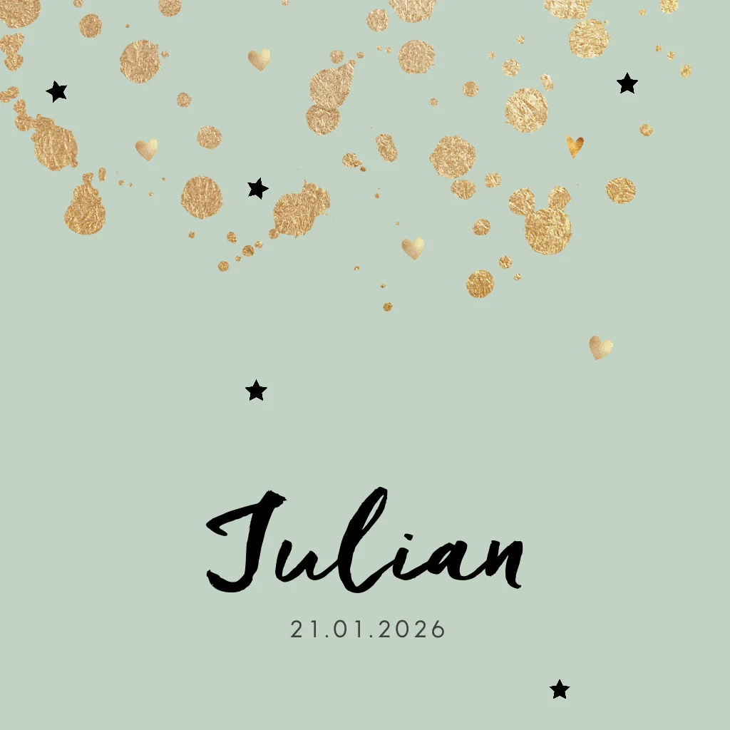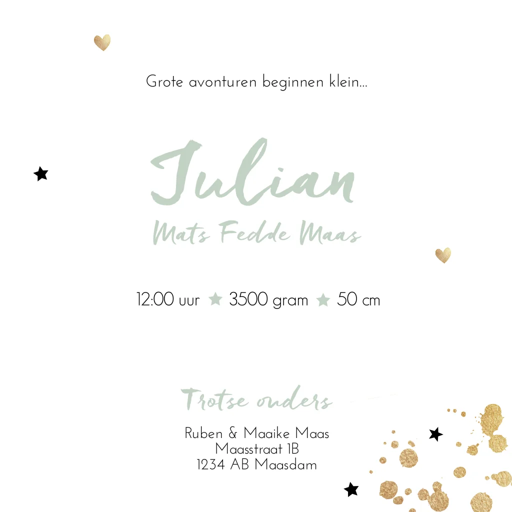 Stoer geboortekaartje voor een jongen met gouden verfspatten op een groene achtergrond. In de binnenkant van het kaartje kun je zelf een foto toevoegen.