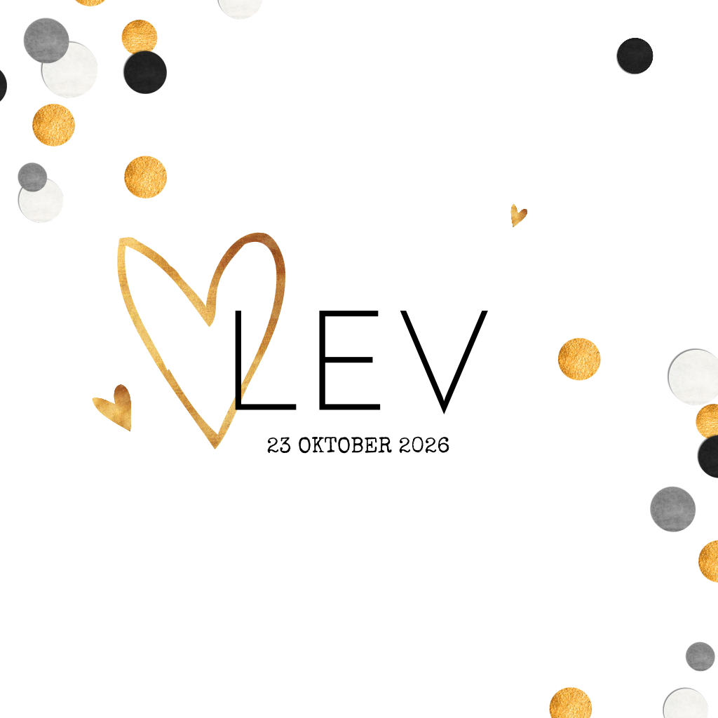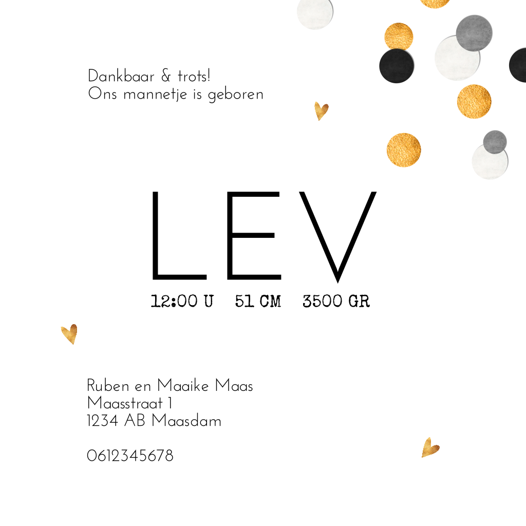 Lief geboortekaartje voor een jongen met goudlook, zwarte en witte confetti. Plaats een foto van je baby'tje in de binnenkant van het kaartje.