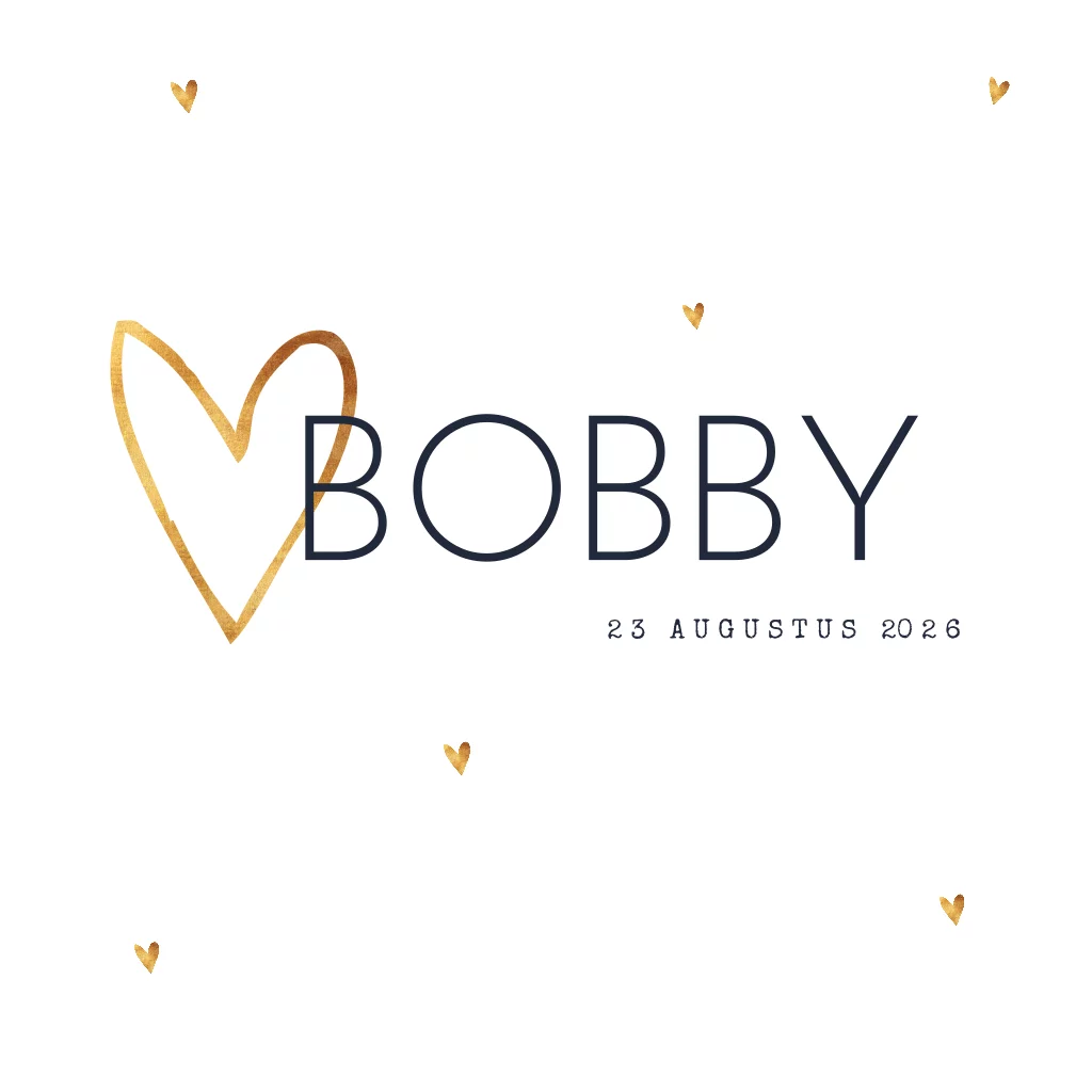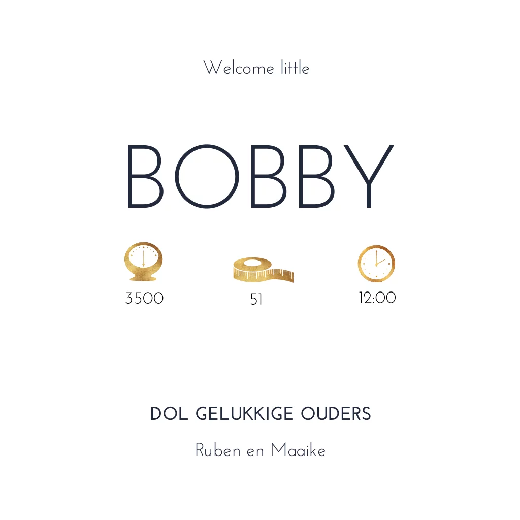 Lief unisex geboortekaartje voor een jongen of meisje met hartjes en goudlook weegschaal, meetlint en klok.