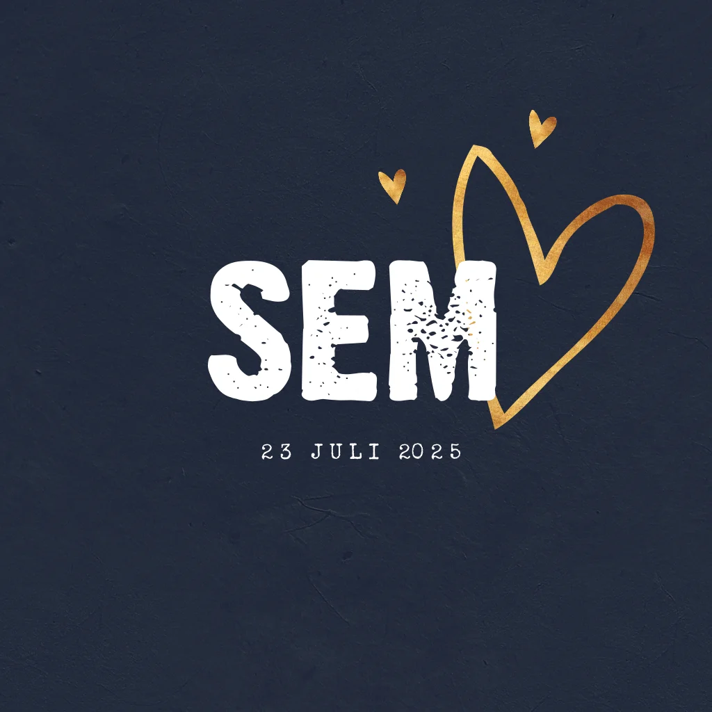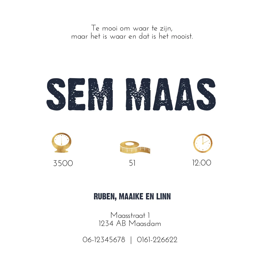 Jongenskaartje met details in goudlook en stoere typografie. Plaats de foto van je pasgeboren baby'tje in de binnenkant van het geboortekaartje.