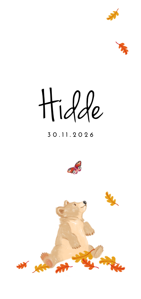 Een lief geboortekaartje met een beertje dat in een de herfstbladeren zit. De kleuren okergeel en oranje passen samen met de blaadjes perfect bij het herfstseizoen. Dit kaartje is ook leuk met een gekleurde envelop.