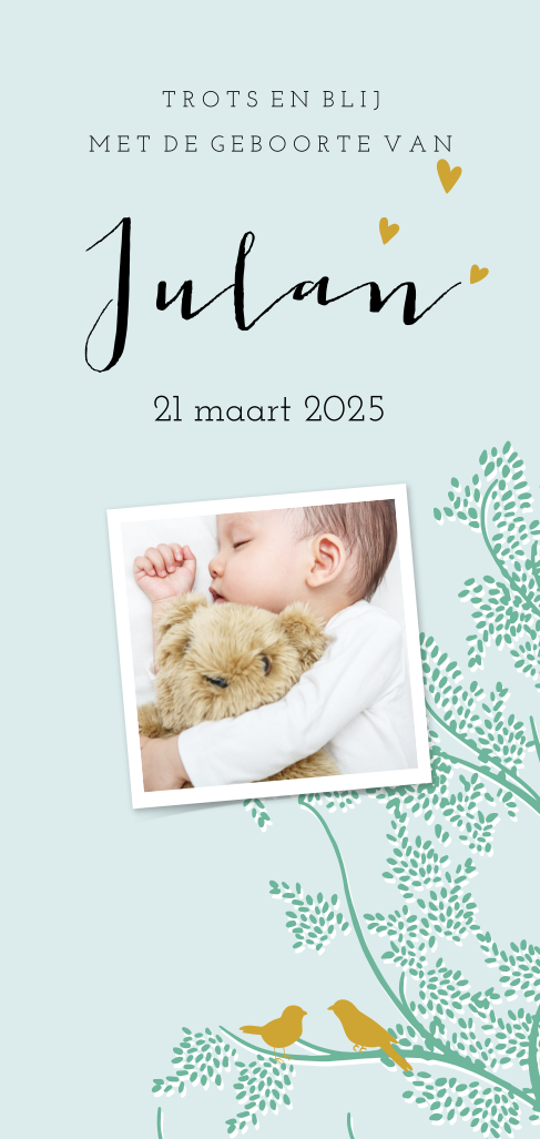 Een fijn getekende boom met twee vogels in goudlook op een takje, wat romantisch! De hartjes maken dit geboortekaartje helemaal compleet. Voeg een leuke foto toe en maak dit kaartje af!