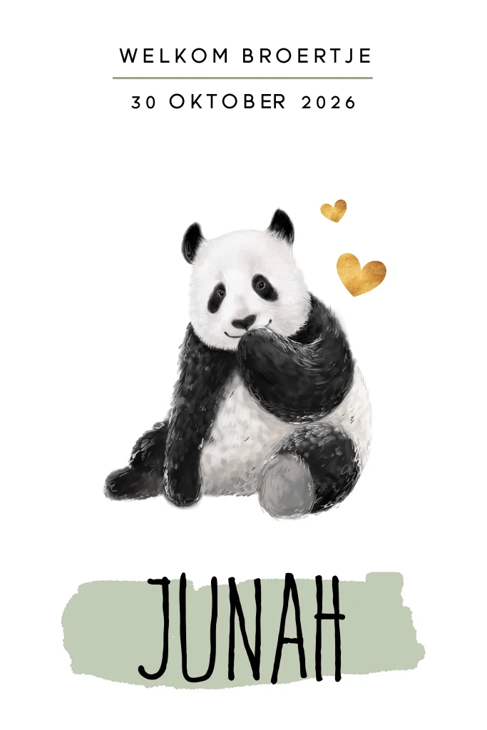 Dit originele geboortekaartje vergeet je niet snel. Wat een eye-catcher! Panda's zijn helemaal hip in 2017 en dat maakt dit ontwerp dubbel zo leuk. Het perfecte geboortekaartje voor een zoon.