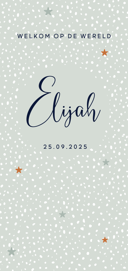 Trendy geboortekaartje in groen met vrolijke stippen en leuke sterretjes. De naam zet je in het midden. Hoe heet jouw kleine uk?