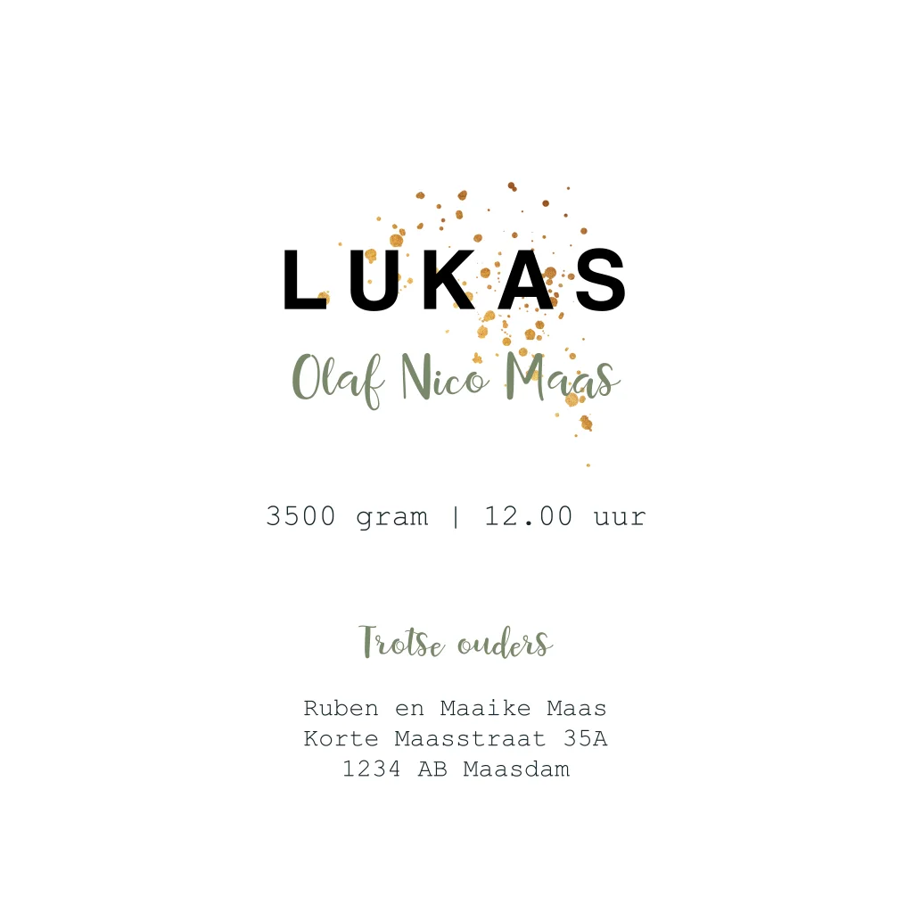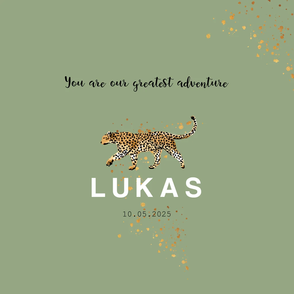 Een stoer en trendy geboortekaartje voor een zoon met een panter en spetters in goudlook. De groene achtergrond kun je eventueel omkleuren met behulp van onze editor. Maak er helemaal jouw kaartje van!