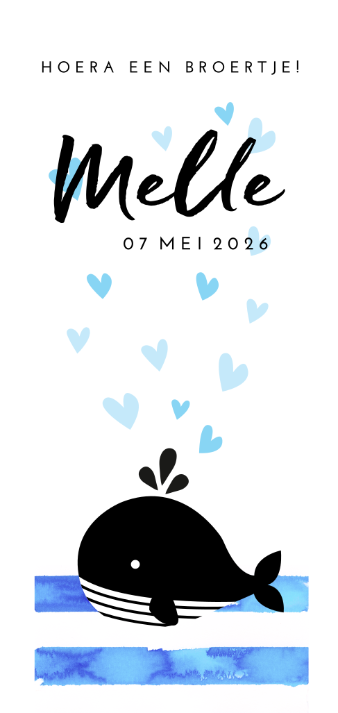 Walvisjes zijn helemaal hip en nu ook te zien op geboortekaartjes voor jongens. Deze trend begrijpen wij helemaal, want hoe schattig is dit kaartje?! Wist je dat je de kleur van de hartjes zelf kunt aanpassen?