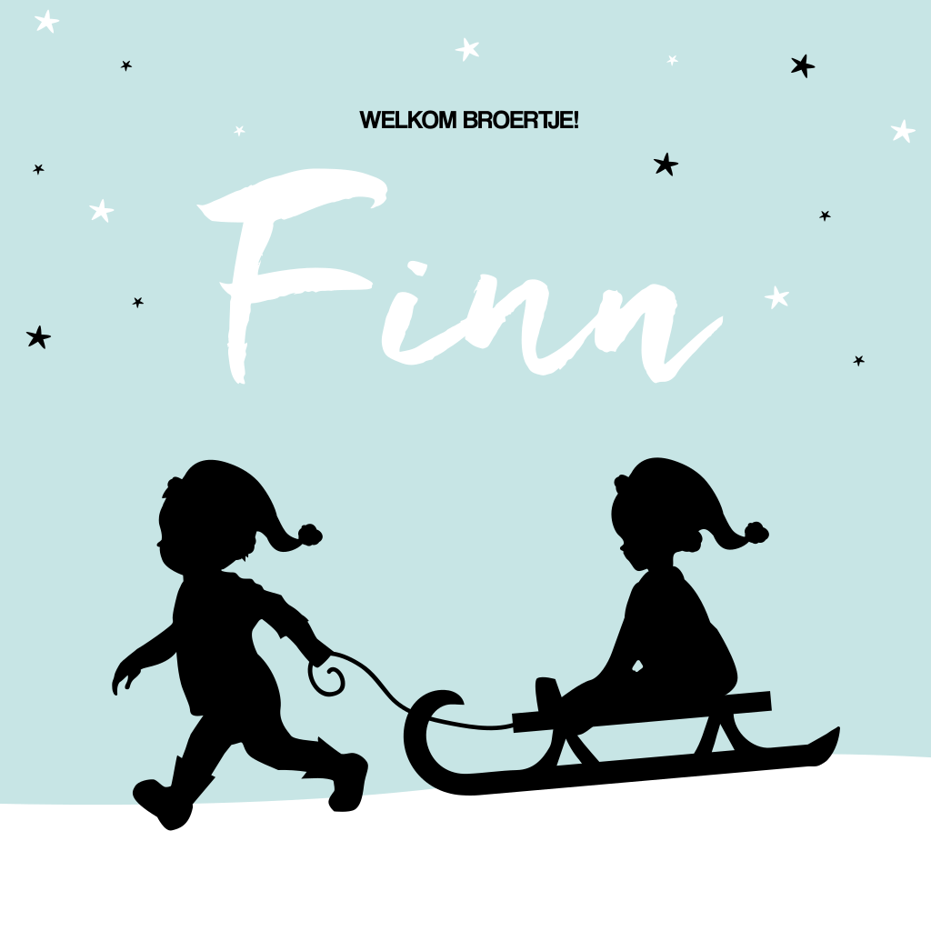 Stoer winters geboortekaartje met silhouetten van spelende broertjes in de sneeuw. Toch liever een andere kleur of lettertype? Pas het gemakkelijk aan in de editor.