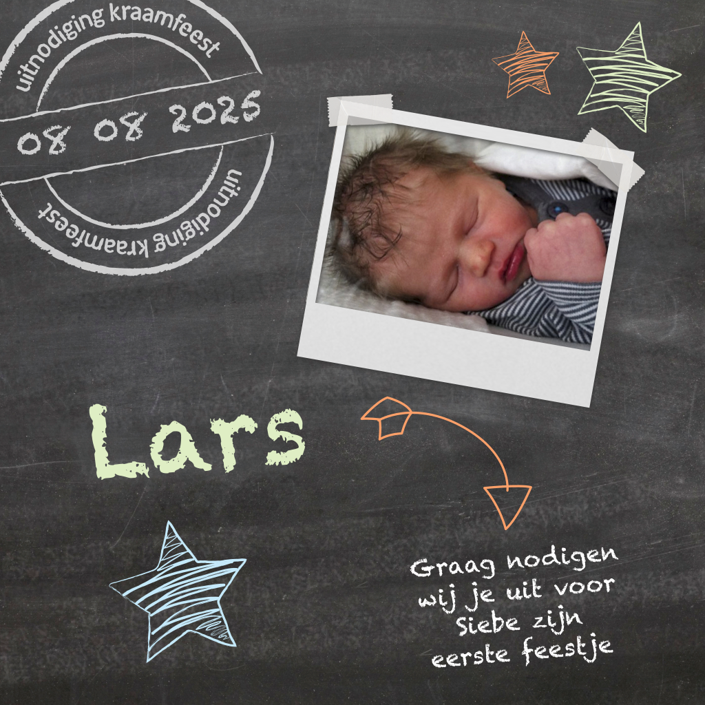Lieve uitnodiging voor een jongen, babyborrel met eigen foto op polaroid. De stempel, sterretjes en pijltjes zijn zelf aan te passen van kleur. Bekijk hier het bijpassende geboortekaartje.