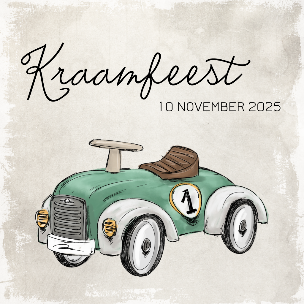 Uitnodiging kraamfeest met vintage uitstraling en stoere loopauto. Bekijk hier het bijpassende geboortekaartje.