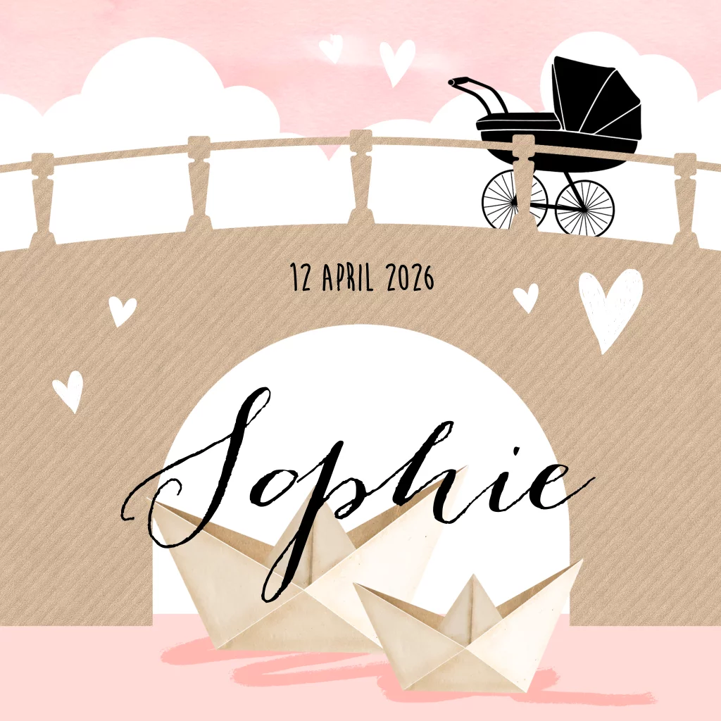 Origineel geboortekaartje voor een meisje met papieren boot en vintage kinderwagen.
