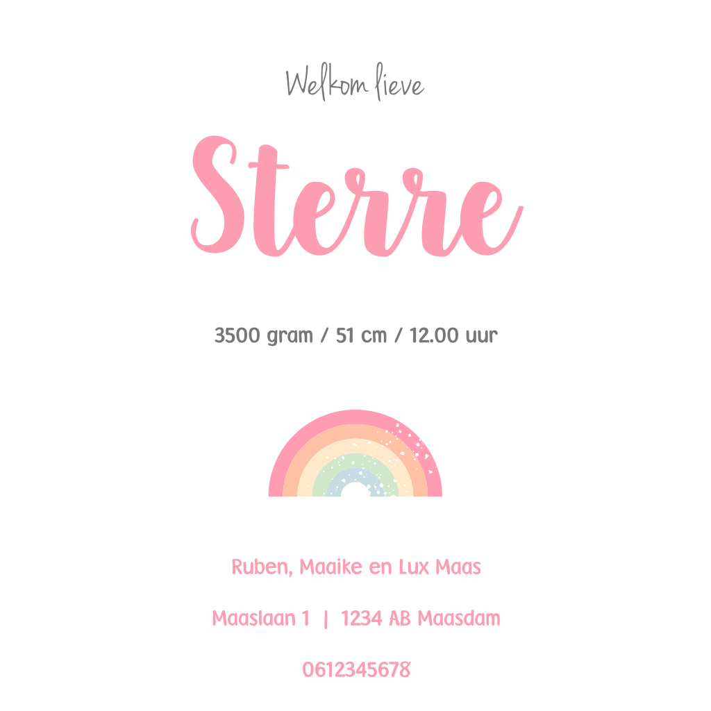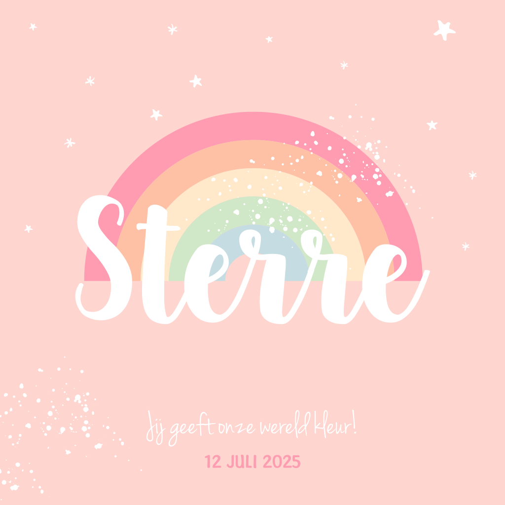 Een lief en vrolijk geboortekaartje in peach met een regenboog en kleine, witte sterretjes. Leuk voor een meisje! Teksten en lettertypes zijn eenvoudig aan te passen.