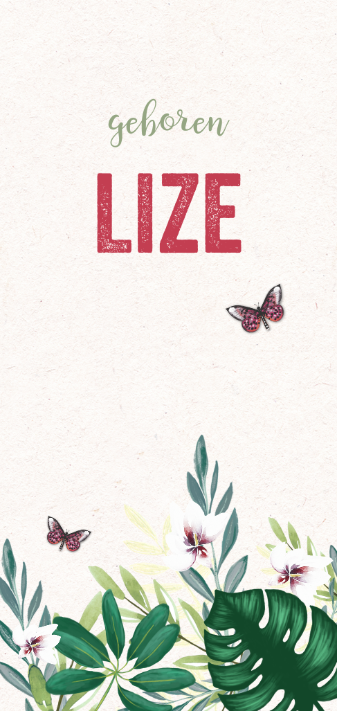 Stoer geboortekaartje met getekende, botanische, groene bladeren en rode vlinders op een kraft achtergrond. Pas kleuren en lettertypen naar wens aan in de editor.
