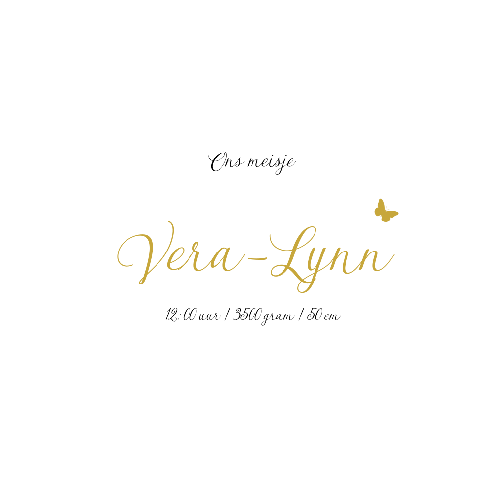 Lief babykaartje met vlindertjes in goudlook erop. Aan de binnenzijde kan je een prachtige foto van jullie dochter plaatsen. Liever geen foto? Je kan het gerust weghalen. Heb je hulp nodig? Wij helpen je graag! Bel of mail ons gerust!
