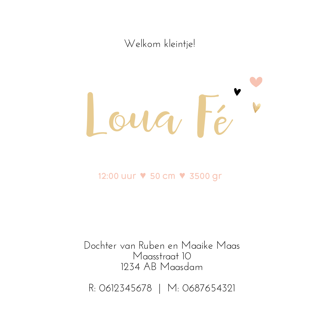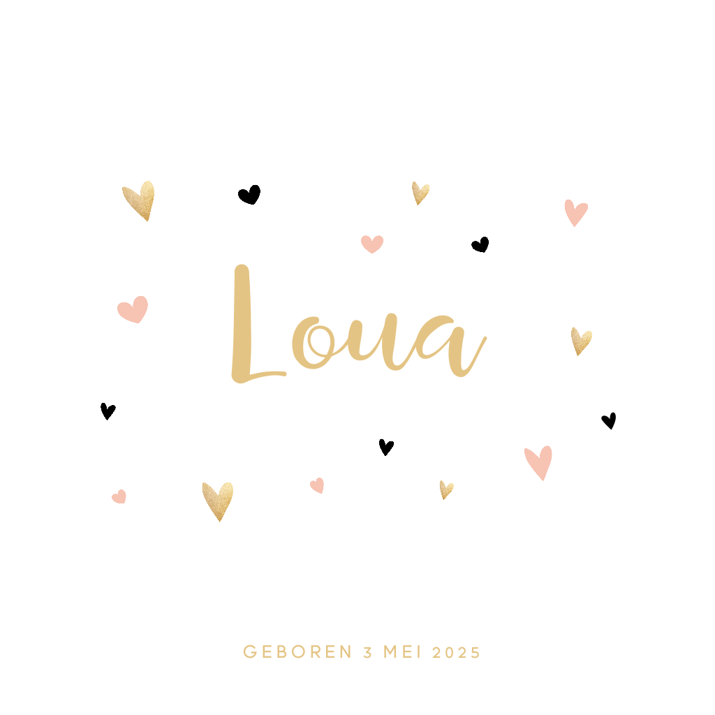 Hartjes in zwart, roze en goudlook op een meisjeskaartje als geboorte-aankondiging: wat schattig! Dit lieve kaartje kun je naar wens aanpassen door met lettertypes en kleuren te spelen. Ook tof is om hem te combineren met een bijpassende sluitzegel, zoals deze https://hippe-geboortekaartjes.nl/product/kraft-sluitsticker-hartje.