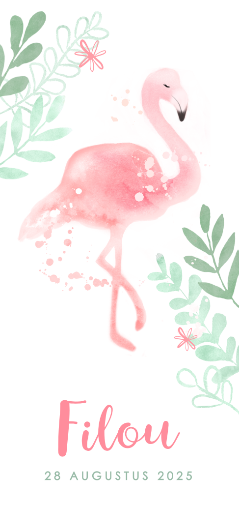 Een roze ooievaar op een geboortekaartje is tegenwoordig helemaal in! In combinatie met de groene planten en het gebruik van watercolourverf, komt dit kaartje goed tot zijn recht. De verfspetters maken hem helemaal af. Maak er helemaal je eigen kaartje van en bestel een eerste proefdruk voor slechts €1,-