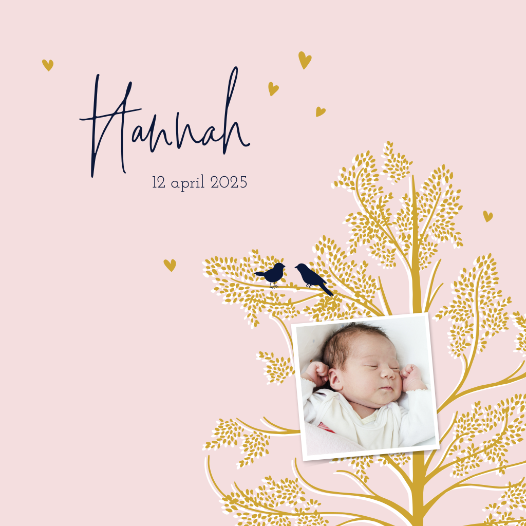 Dit lieve geboortekaartje in roze is versierd met een fijn getekende boom in goudlook met witte accenten, kleine hartjes en twee zwarte vogels in de boom. Ook kun je op de voorkant een persoonlijke foto toevoegen. Leuk voor een meisje!