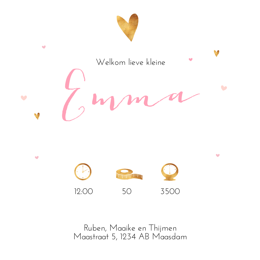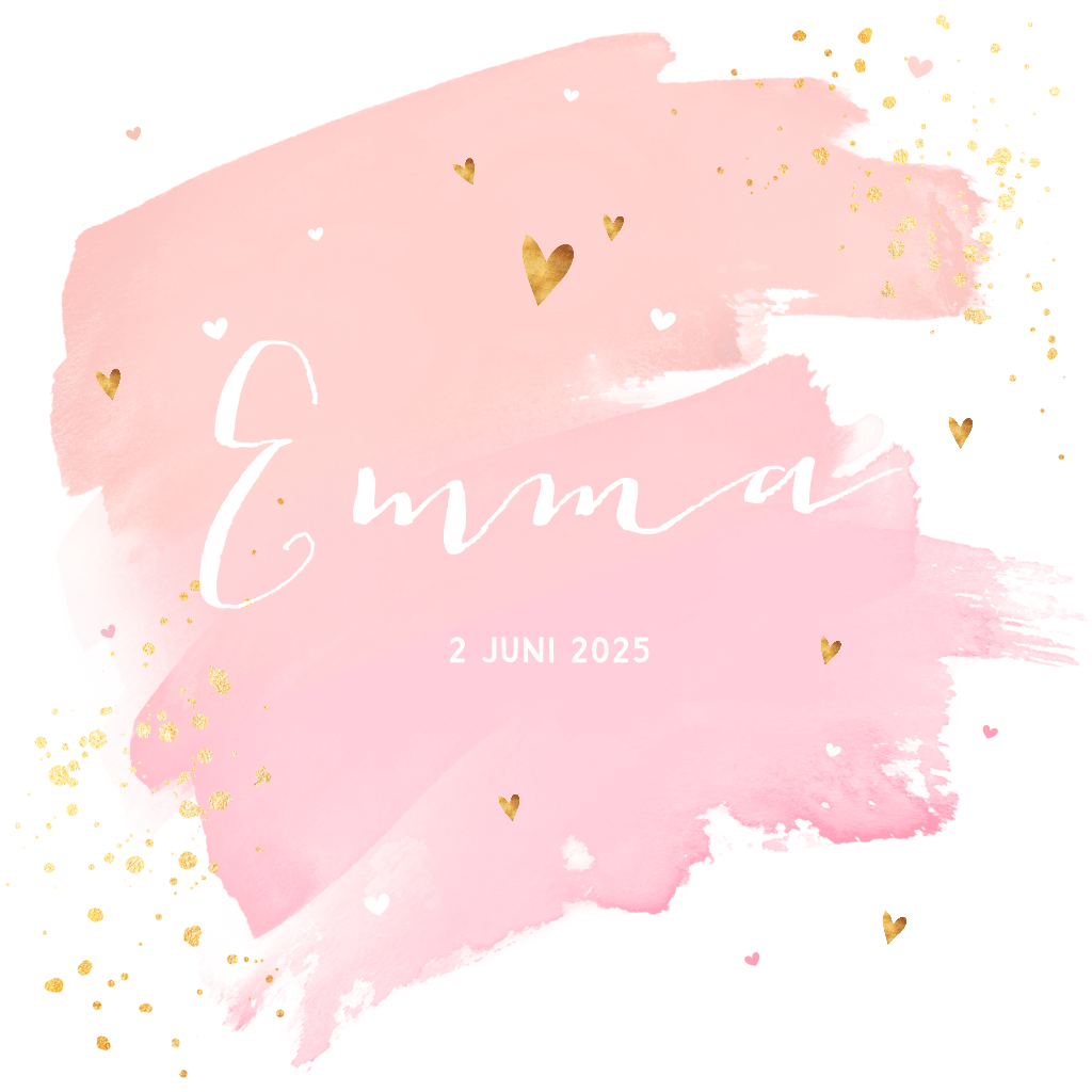 Een super hip geboortekaartje voor jullie dochter. De trend van 2018: watercolour! De hartes en spetters in goudlook maken dit kaartje super hip en lief! Maak dit kaartje compleet met een gekleurde envelop en een sluitsticker.