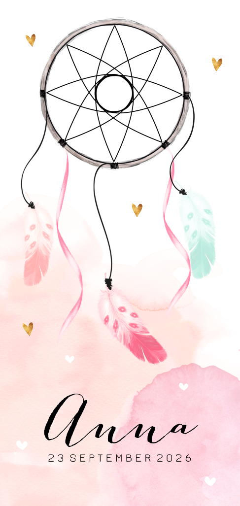 Bijzonder geboortekaartje met een bohemian dromenvanger. Dit prachtige design is ontworpen door hipDesign. Word jullie dochter in de lente of zomer geboren? Dan is dit geboortekaartje door de frisse kleuren perfect.