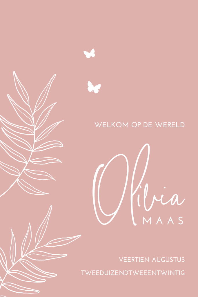 Dit roze geboortekaartje met getekende takjes en vlinders is leuk voor een meisje! De achtergrondkleur is naar wens aan te passen en ook lettertypes kun je veranderen. Maak er helemaal je eigen kaartje van!