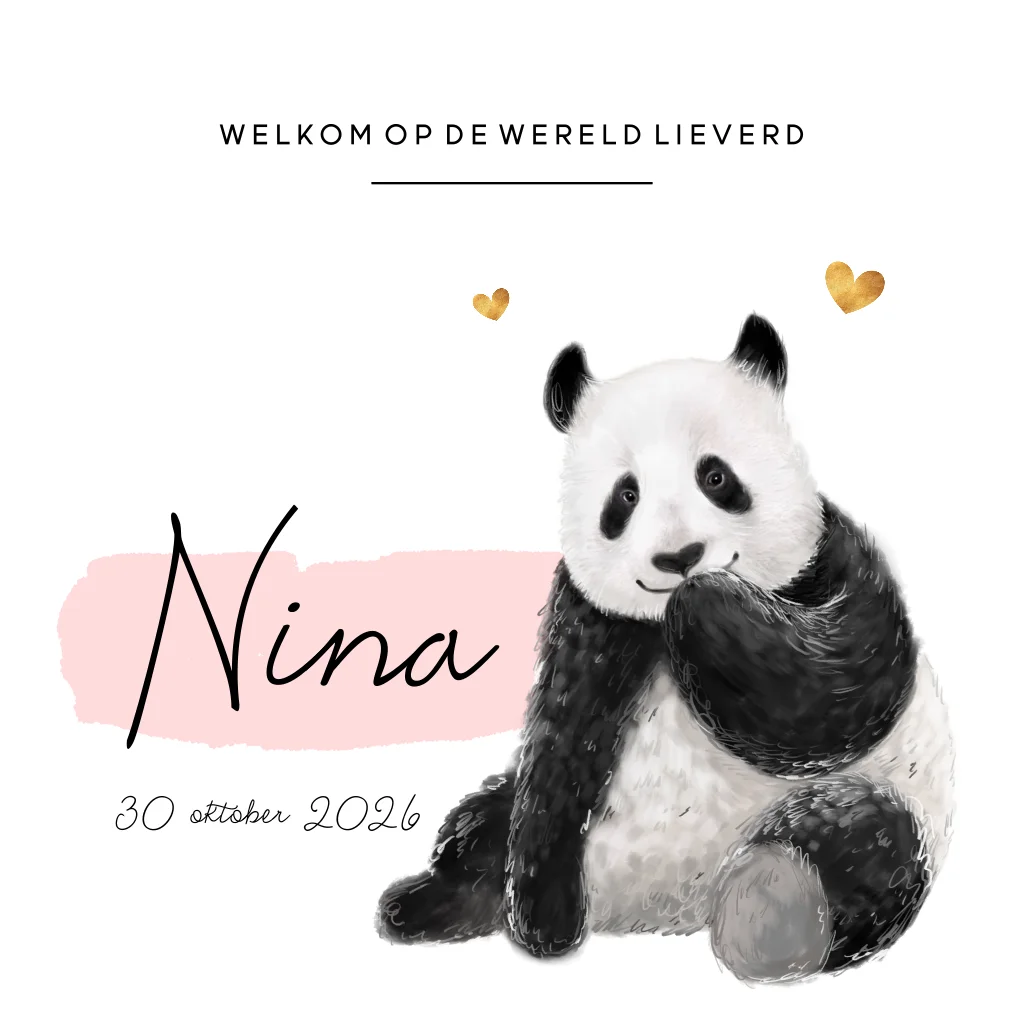 Panda's zijn de trend van nu. Nu ook te zien op dit bijzondere geboortekaartje ontworpen door hipDesign. De illustratie van deze schattige pandabeer is met de hand geschilderd. Een gave combi met het strakke zwart/witte design met hartjes in goudlook.