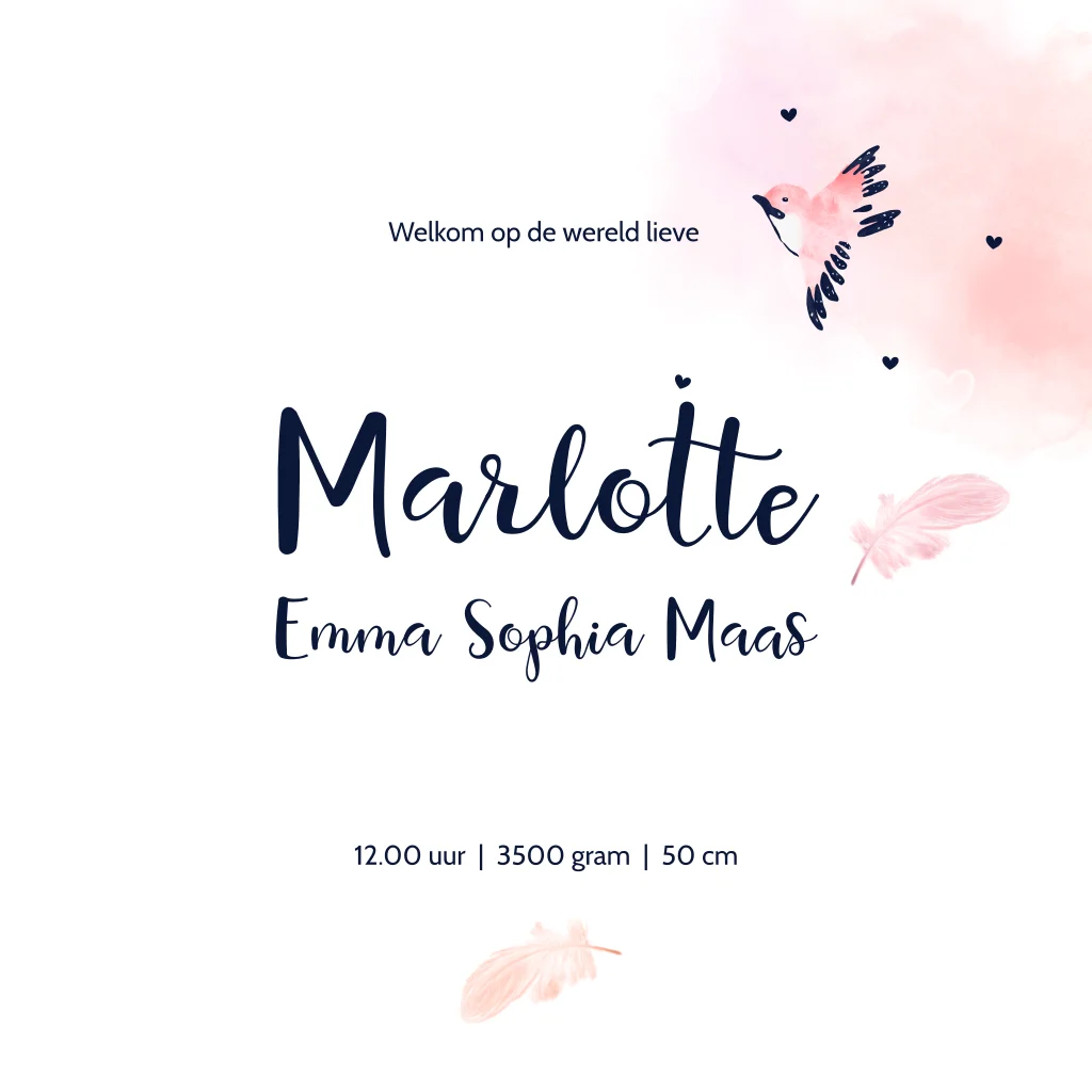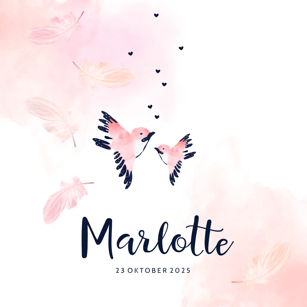 Vogeltjes, veertjes, watercolour en kleine hartjes: een schattig kaartje voor de geboorte van je kleine meisje! Leuk te combineren met een roze envelop.