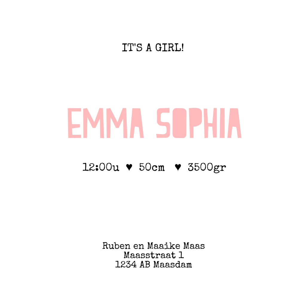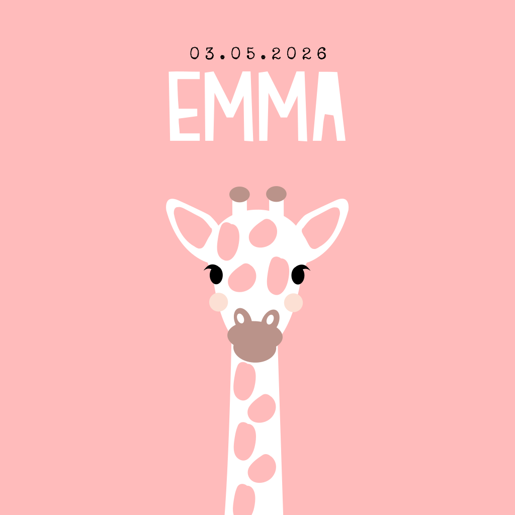 Hip geboortekaartje met illustratie van giraffe voor meisje op een roze achtergrond. In de binnenkant van het kaartje kun je een foto toevoegen.