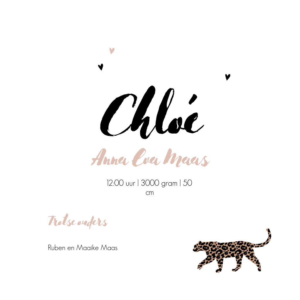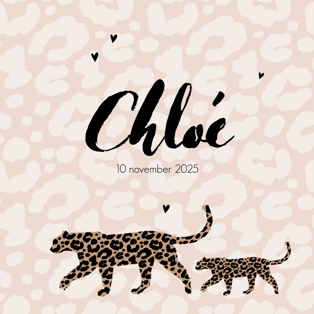 Een stoer geboortekaartje voor een meisje, met twee panters op een achtergrond met een roze panterprint. Lief zijn de kleine, zwarte hartjes. Maak jij dit kaartje compleet?