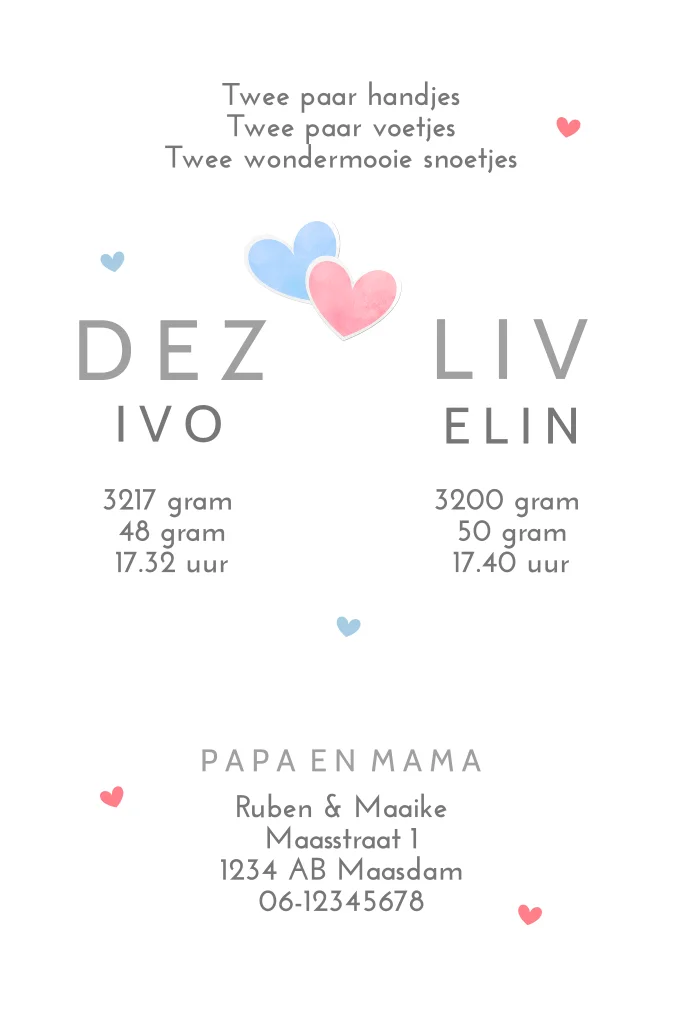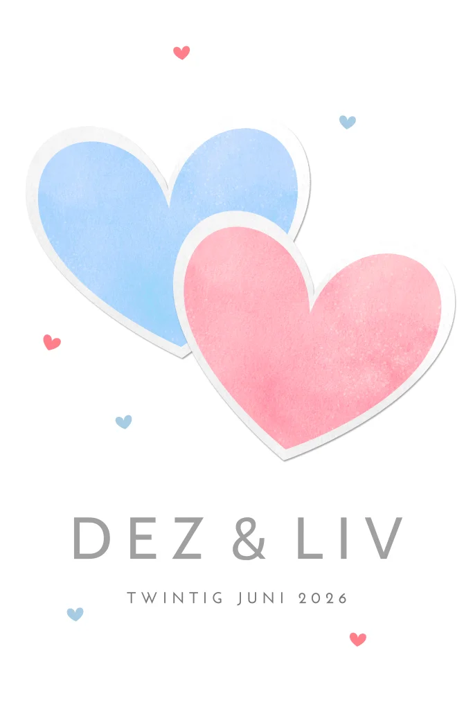 Simpel geboortekaartje voor de geboorte van een zoontje en een dochtertje. Dit leuke ontwerp met roze en blauwe hartjes is tijdloos en speciaal ontworpen voor een tweeling.