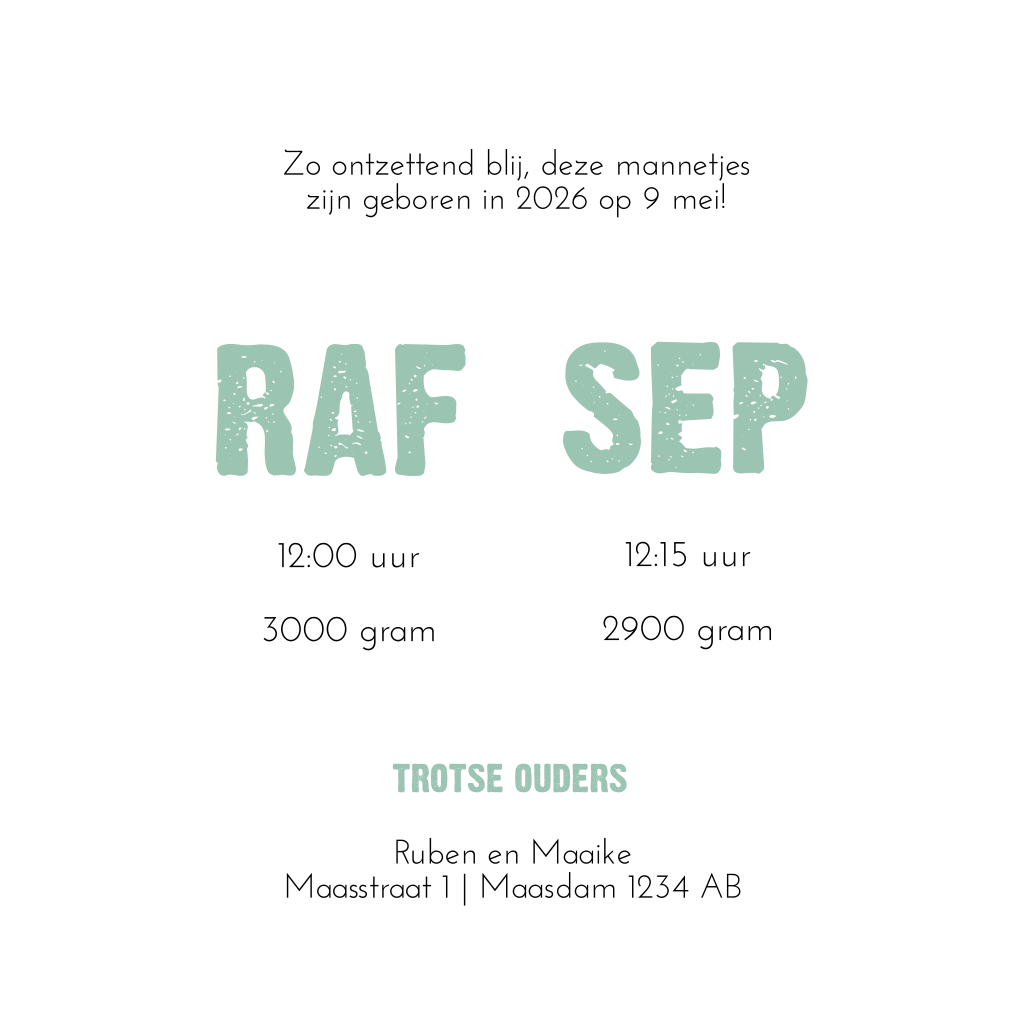 De designers van hipDesign combineerden de de boom en silhouet trend. Het resultaat; dit gave geboortekaartje voor de geboorte van twee zonen. Je kunt zelf gemakkelijk de kleuren van de silhouetten aanpassen. Hulp nodig? Neem contact op met onze klantenservice. Zij helpen je graag verder.