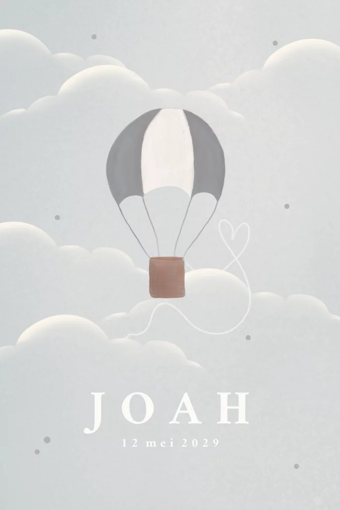 Een lief geboortekaartje voor jouw zoon. Het kaartje heeft een blauwe achtergrond met wolkjes. Daarin zie je een luchtballon zweven. Pas het ontwerp naar wens aan in onze online editor.