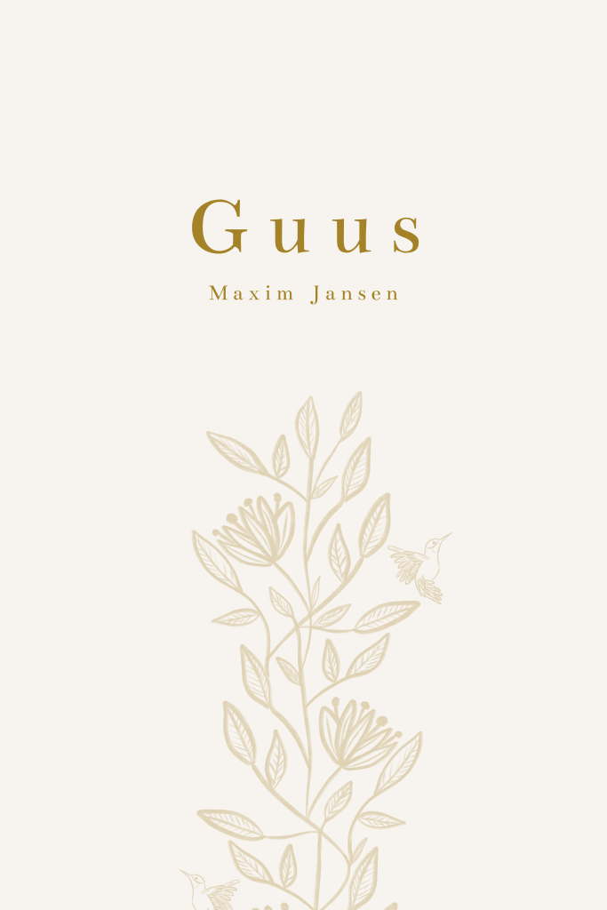 Op dit mooie geboortekaartje staat de handgetekende illustratie van een slinger met bloemen en blaadjes en kolibrie vogels. Pas de teksten en kleuren naar wens aan in de online editor.