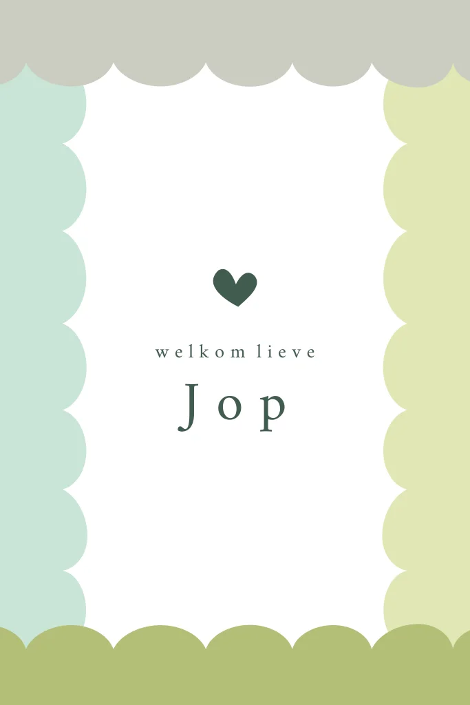 Een hip en vrolijk geboortekaartje voor jouw zoon. Het kaartje heeft groene tinten en speelse vormen. In het midden lees je de naam van het kindje. Pas het ontwerp naar wens aan in onze online editor.