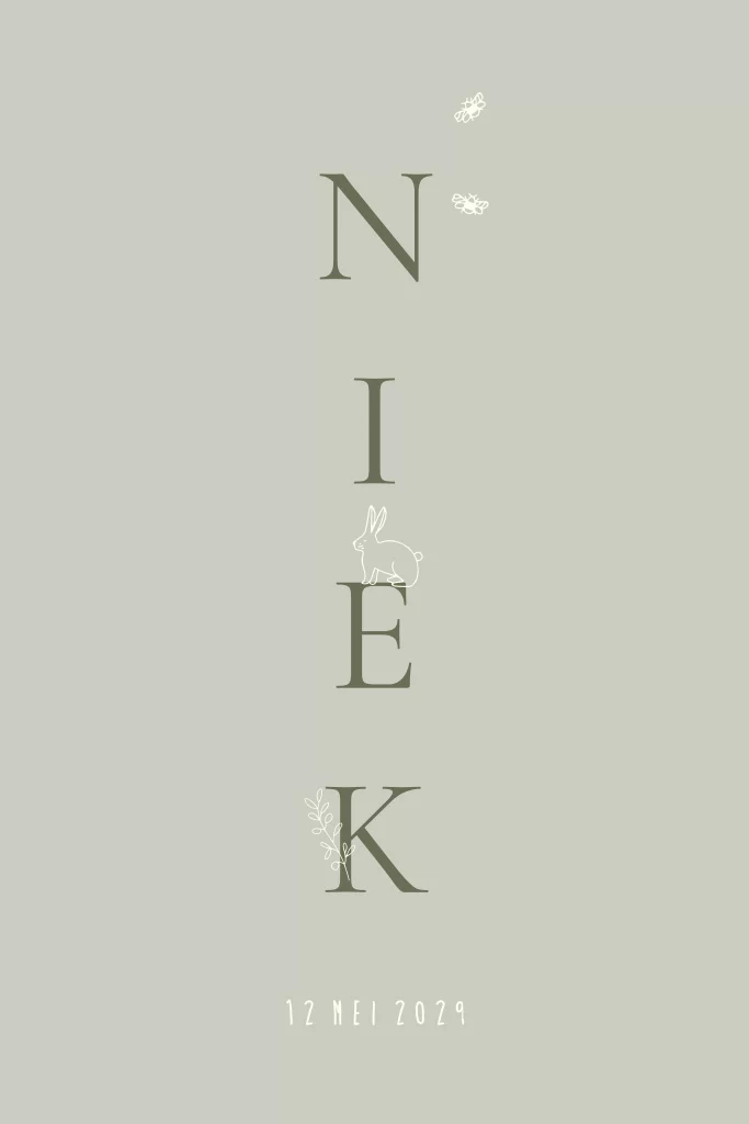 De voor- en achterkant van dit kaartje kan je ontwerpen met de naam en geboortedatum in folie. Dit kaartje heeft een groene achtergrond. Pas het kaartje naar wens aan in de online editor.