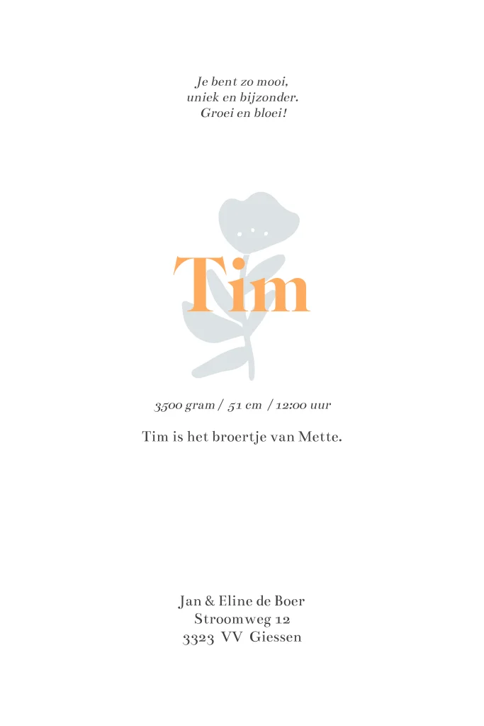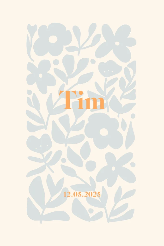 Een lief geboortekaartje voor de geboorte van jullie zoontje. Het kaartje heeft zachte tinten en een rechthoekig design van bloemenprint. De naam van jullie kleintje staat in vrolijk oranje in het midden van het kaartje.