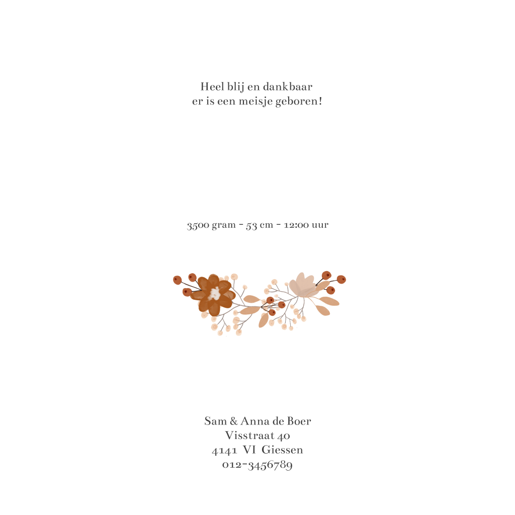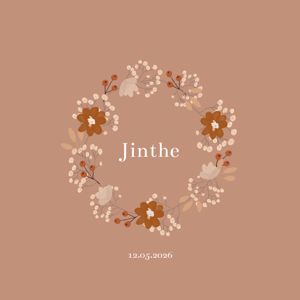Een romantisch geboortekaartje voor de geboorte van jullie dochtertje. De bloemenkrans is handgeschilderd. De naam van jullie kleintje staat in het midden van de krans in roségoudfolie gedrukt. Ook aan de binnenkant van het kaartje staat de naam in roségoud.