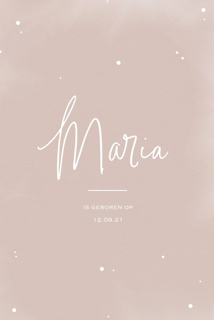 Typografisch geboortekaartje in taupe met stipjes en een hip lettertype. Een eenvoudig design waarbij de naam echt in het middelpunt staat! Hoe heet jouw dochter?