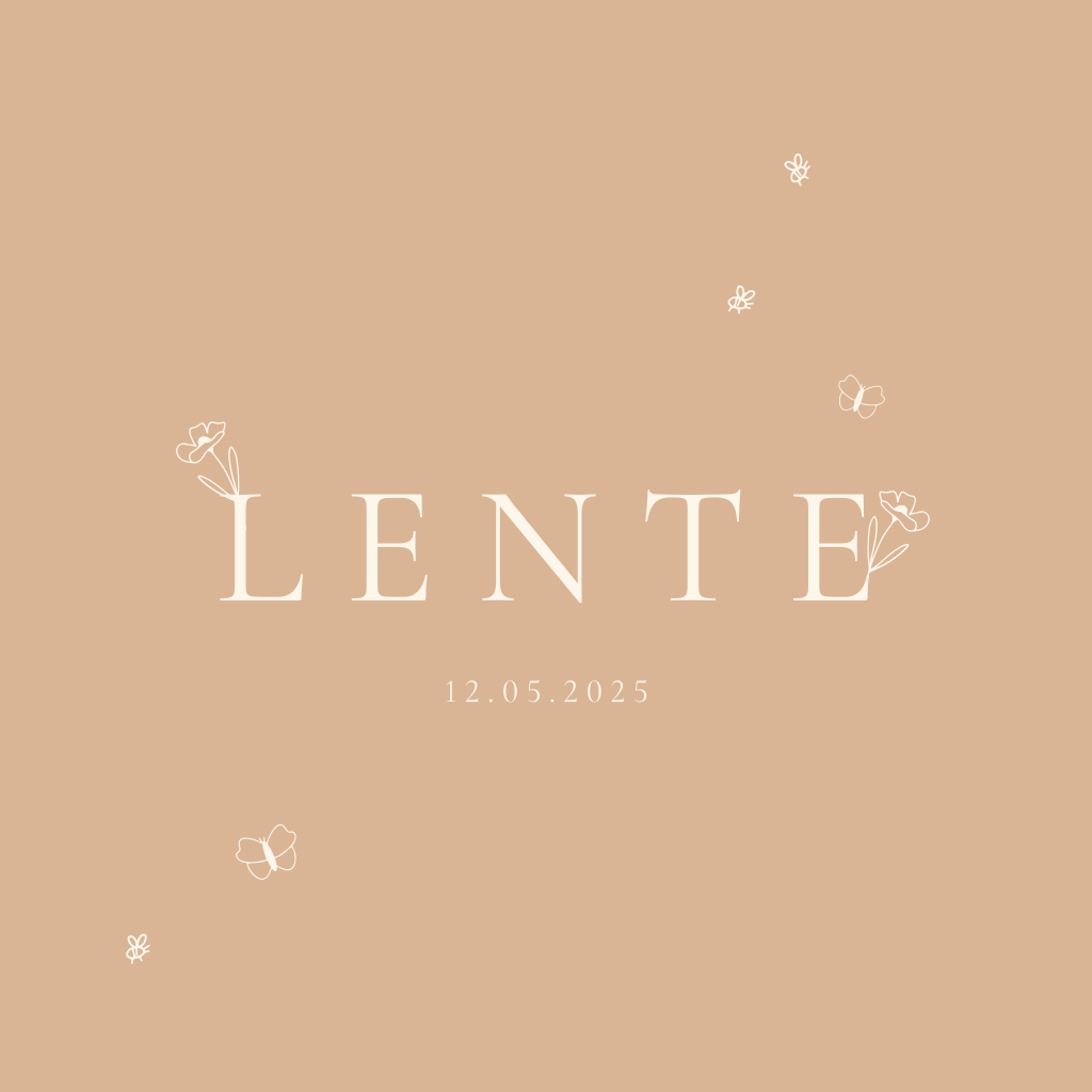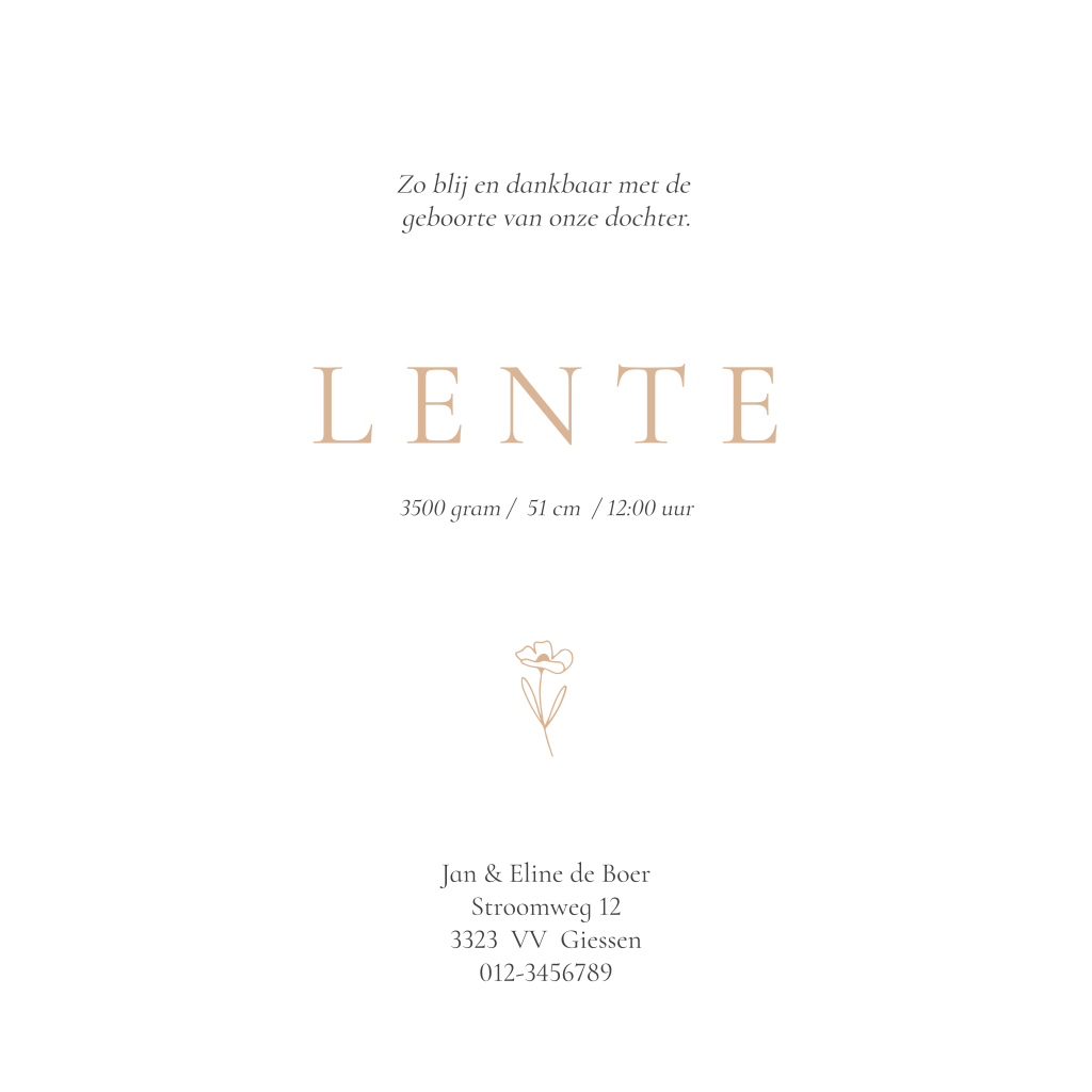 Een mooi eenvoudig geboortekaartje met lijntekeningen van bloemen, bijtjes en vlinders. Het kaartje heeft een zachte neutrale achtergrond wat het kaartje eenvoudig maakt. De naam van jullie kindje staat in het midden van het kaartje met daar omheen schattige bloementjes, vlindertjes en bijtjes die het lentethema compleet maken.