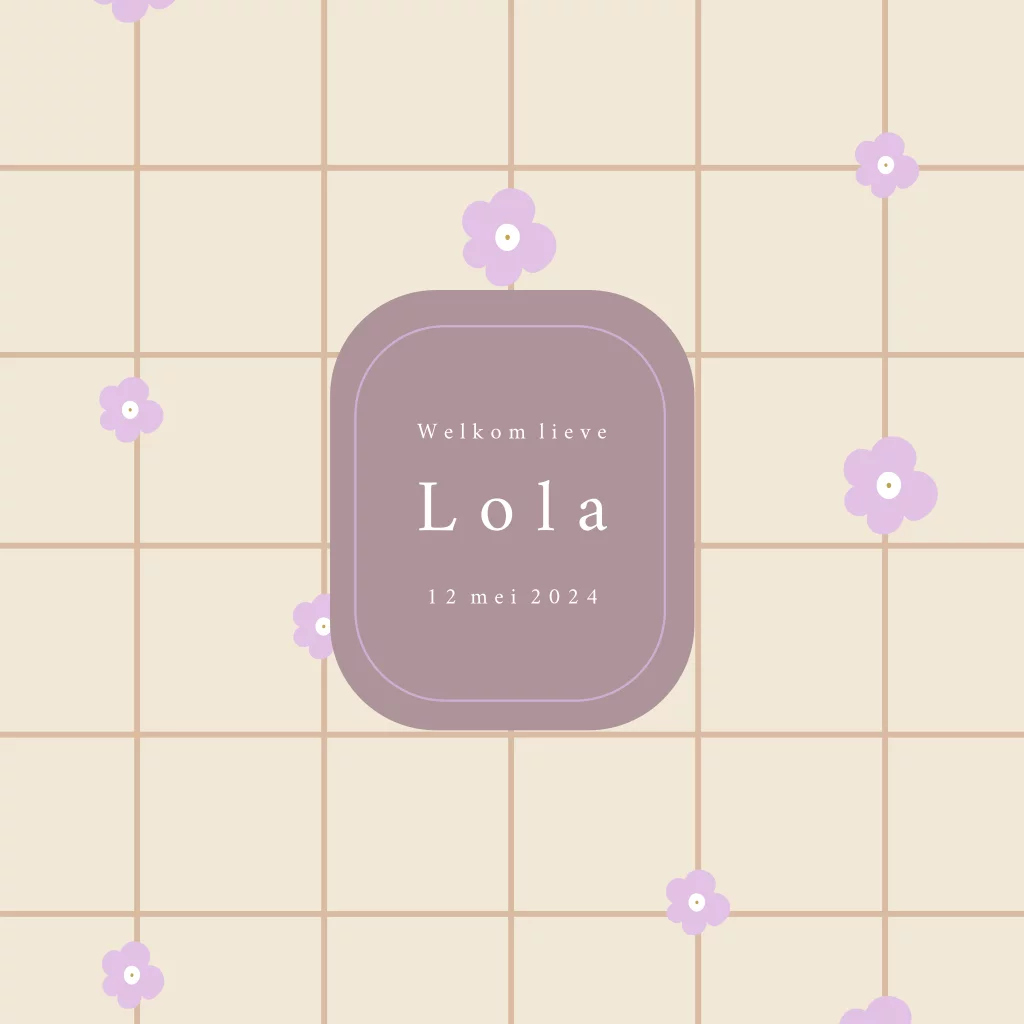 Geboortekaartje meisje met ruitjespatroon en lila bloemetjes