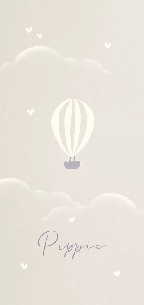 Wat een lief geboortekaartje. Dit kaartje heeft een langwerpig formaat met beige achtergrond. Je ziet wolkjes en een lila luchtballon. Pas het ontwerp naar wens aan in onze online editor.Dit product maakt onderdeel uit van deze set.