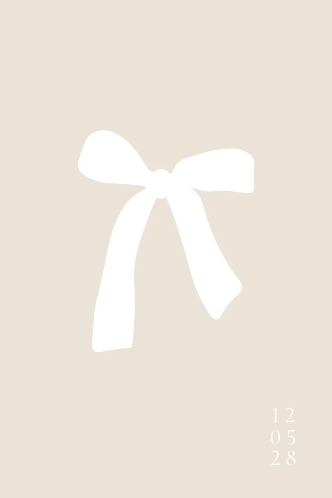 Een stijlvol en lief geboortekaartje voor jouw kindje. Het kaartje heeft een beige achtergrond met daarop een witte strik. Het kaartje heeft ronde hoeken. Pas het ontwerp naar wens aan in onze online editor.