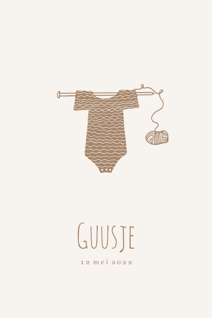 Kondig de geboorte van jullie kleintje aan met dit mooie kaartje. Centraal op het kaartje staat een gebreid rompertje. Het kaartje is naar wens aan te passen in onze online editor en bestel een proefdruk om dit kaartje in het echt te bewonderen!