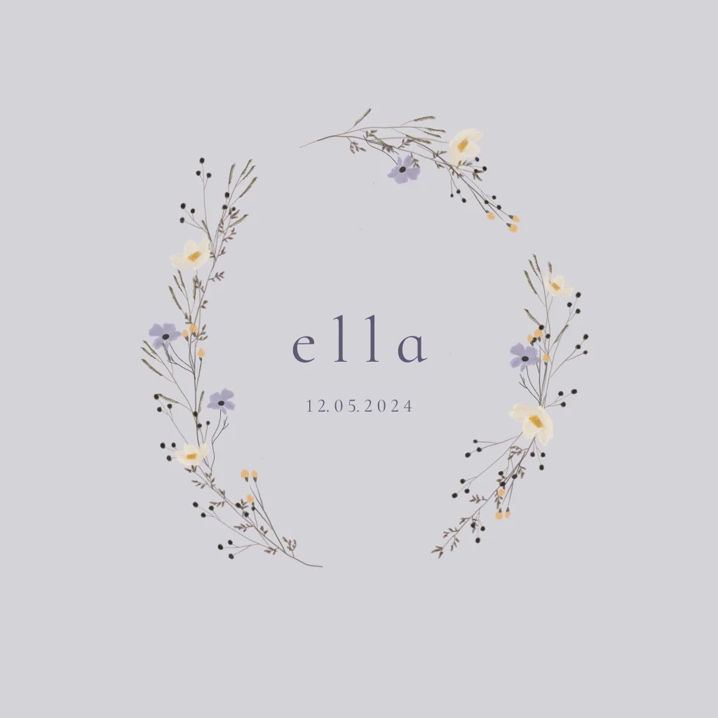 Een schattig geboortekaartje met ronde hoeken voor jouw meisje. Het kaartje heeft een gebroken witte achtergrond met daarop een lieve bloemenkrans. De krans heeft lila en witte bloementjes met daarbij verschillende takjes.